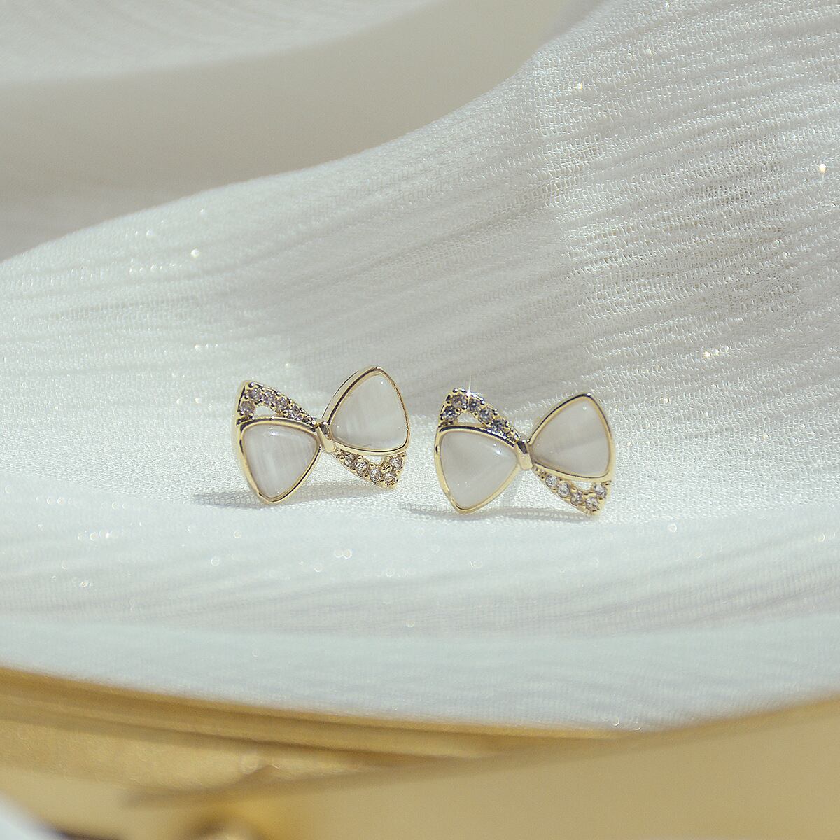 キャッツアイでダブルのリボンをかたどった華やかなピアス。