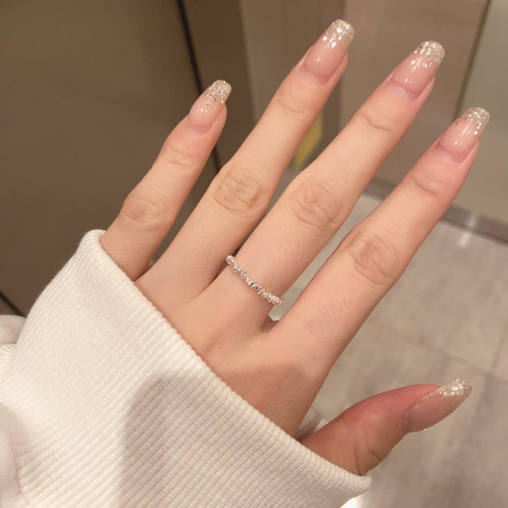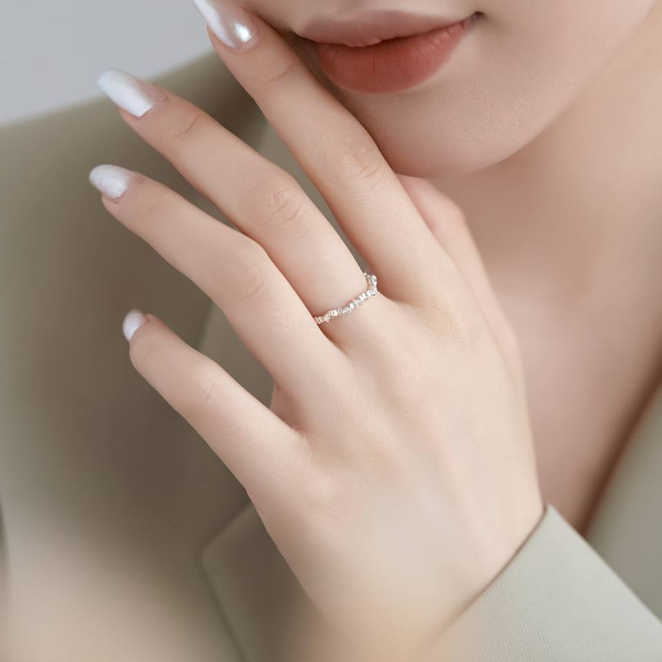 ニュアンスのある不揃いなシルバービーズをゴムに通し、高級感ある素材ながら気軽に使えるリング